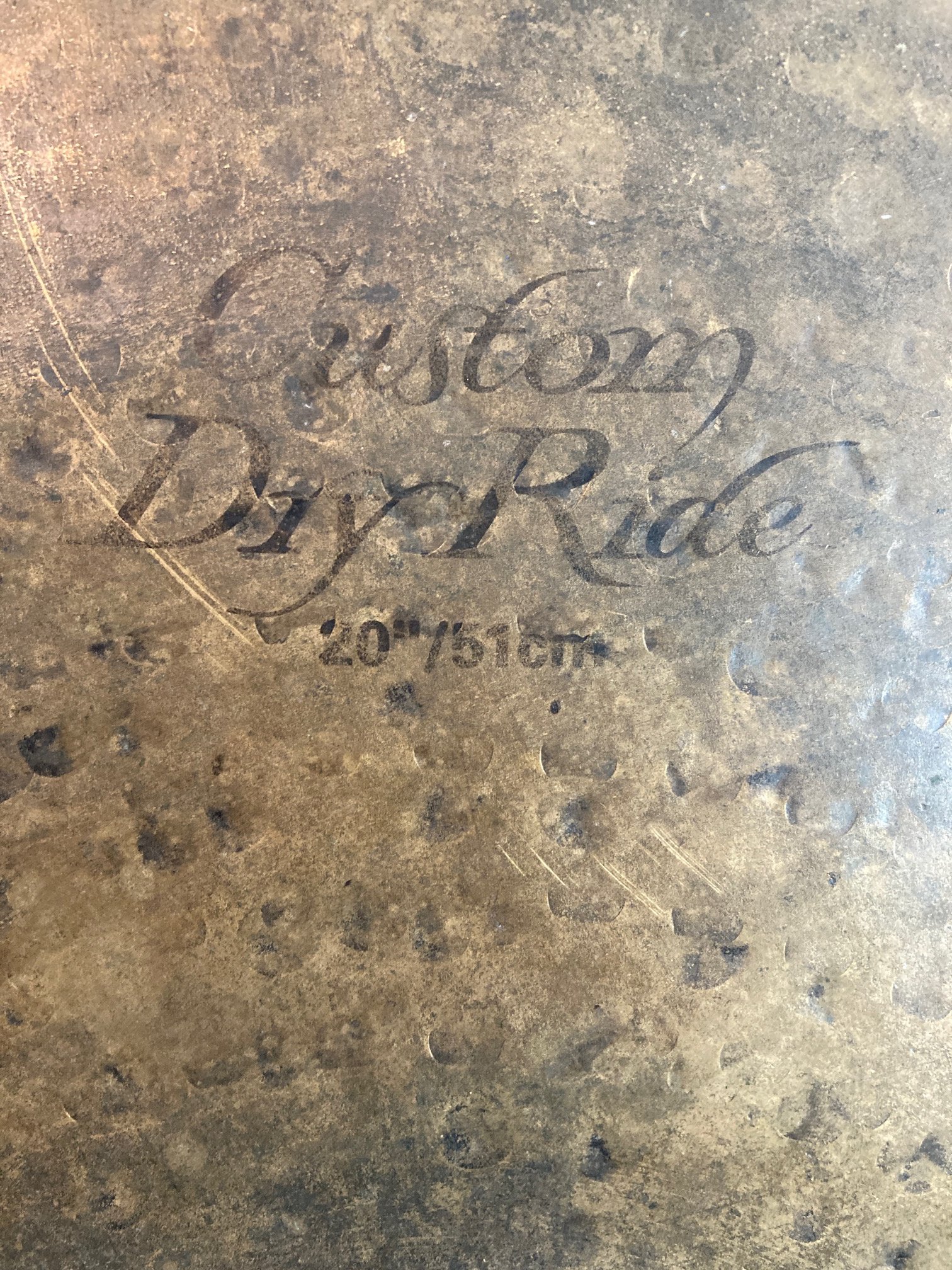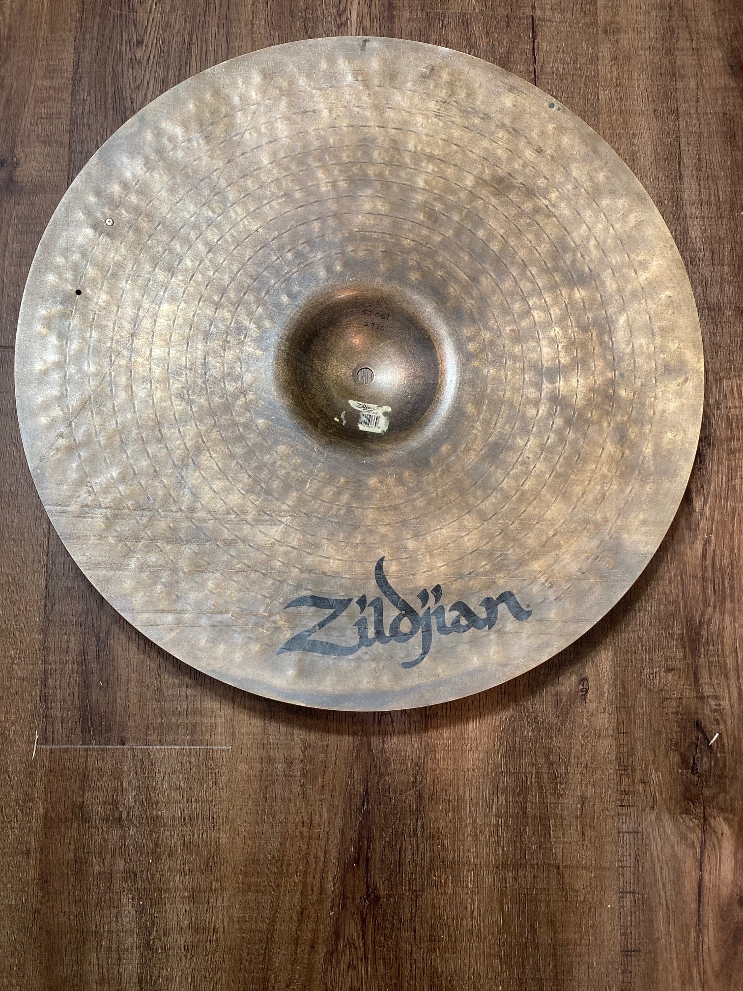 From George Lawrence -Up for sale is a nice Zildjian 20" K Custom Dry Ride weighing in at 2970 grams. No cracks, fleabites or keyholing. There is a slight bend on the side of the cymbal so I am discounting $125 off the original price of $375. Very nice hammering on the top of this cymbal, and the thicker 2970 weight allows for excellent stick definition and clarity. There are 2 rivet holes, and one factory rivet.